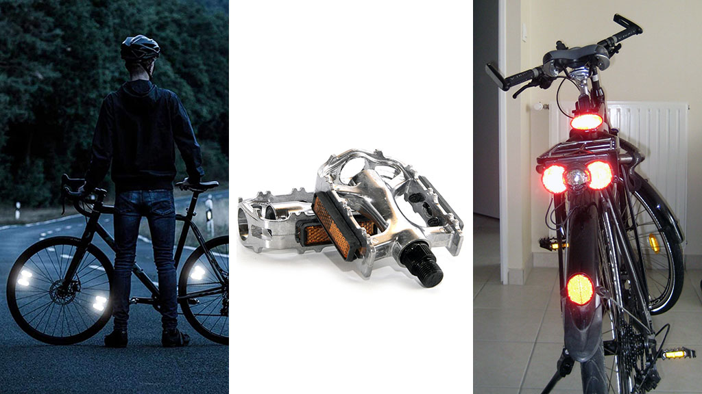 - Catadióptricos: Aunque a algunas personas les resulten poco estéticos, por la noche cuando son iluminados por otros vehículos aumentan nuestra visibilidad notablemente. Los habituales son los que se colocan en los radios de las ruedas y en los pedales. También hay portabultos que presentan un catadióptrico rojo en la parte posterior. El catadióptrico trasero rojo, que no puede ser triangular, es obligatorio para circular de noche.