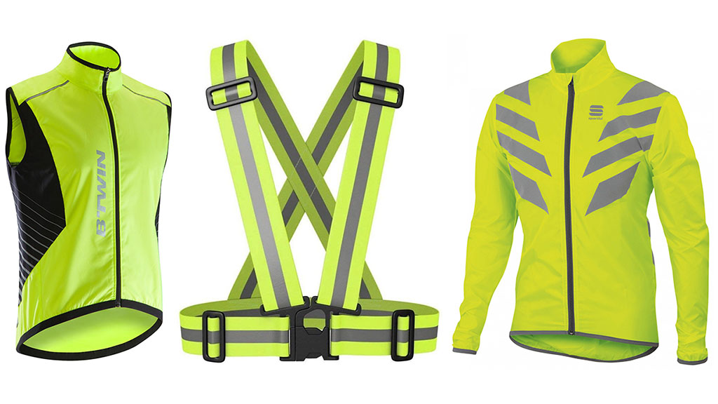 - Chaleco reflectante: Por su color amarillo de alta visibilidad y sus bandas reflectantes es muy llamativo. Los hay de dimensiones muy reducidas, incluso dos simples tiras. Nos pueden valer para cumplir la misma función camisetas de ciclismo o de correr de colores llamativos, aunque si paramos a hacer una visita o a tomar algo es más fácil quitarse el chaleco para pasar más desapercibido. Es obligatorio llevar una prenda reflectante en carretera cuando las condiciones de visibilidad hacen necesario el uso de alumbrado, debe estar homologada y ser visible a 150 metros.