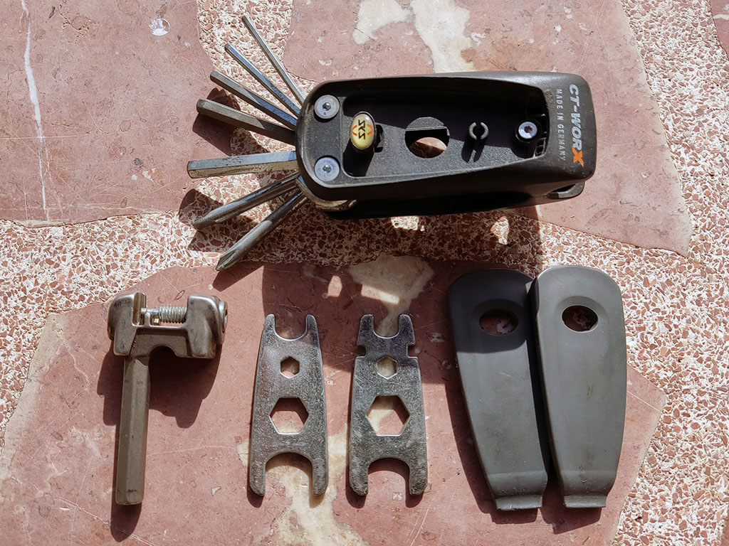 Para un viaje corto (hasta tres días, por poner un tope) no hace falta que en nuestro equipaje llevemos todo el arsenal de herramientas. Las probabilidades de una gran avería son escasas, si antes de salir hemos comprobado que nuestra bicicleta está en un estado digno. Las averías más habituales son los pinchazos, para lo que siempre debemos estar preparados. Con una multiherramienta a mano podemos hacer ajustes rápidos o apretar algún tornillo. Las hay desde muy sencillas y básicas (como ésta de Decathlon o ésta de Parktool) hasta muy completas (como ésta Crank Brothers o ésta de Topeak). Esto es importante porque hay que tener en cuenta lo que no lleva la multiherramienta para llevarlo por separado.